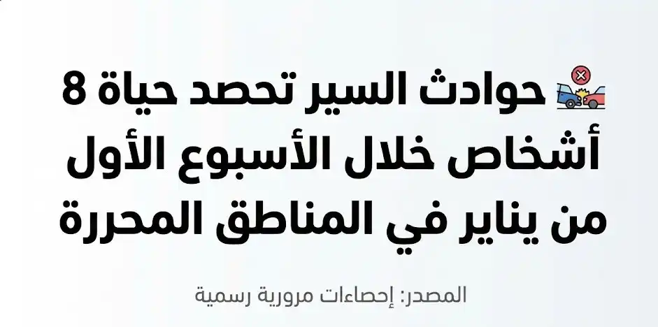حوادث السير تحصد 8 وفيات و84 إصابة خلال الأسبوع الأول من يناير