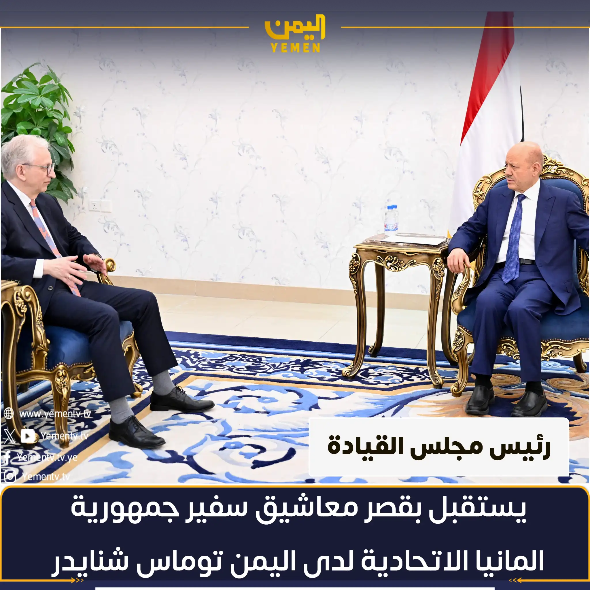 استقبل فخامة الرئيس الدكتور رشاد محمد العليمي، رئيس مجلس القيادة الرئاسي، اليوم الأربعاء في قصر معاشيق، سفير جمهورية ألمانيا الاتحادية لدى اليمن توماس شنايدر.