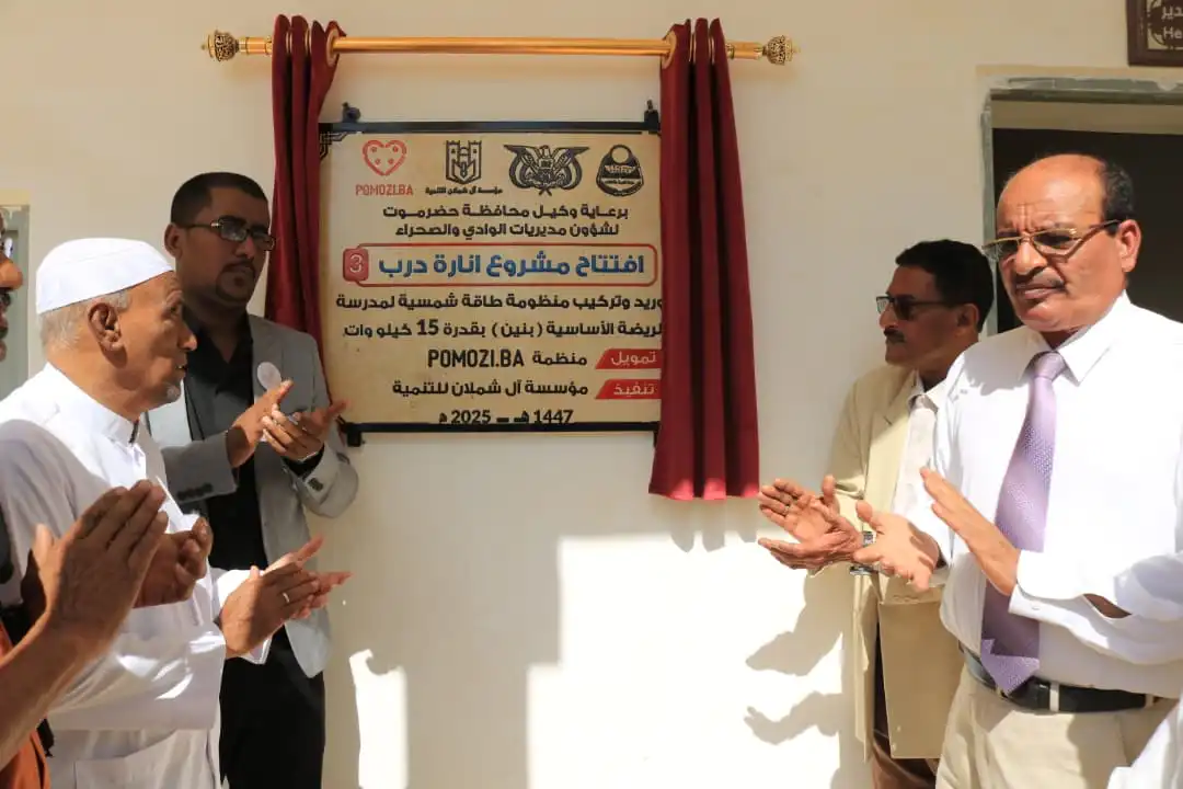 افتتح وكيل محافظة حضرموت المساعد لشؤون مديريات الوادي والصحراء، عبدالهادي التميمي، اليوم، مشروع “إنارة درب 3” في مديرية تريم، بحضور مدير عام المديرية عبدالكريم بابطاط، ضمن مبادرة تنموية نفذتها مؤسسة آل شملان للتنمية بتمويل من منظمة POMOZI.BA  وإشراف مكتب التربية والتعليم بوادي وصحراء حضرموت