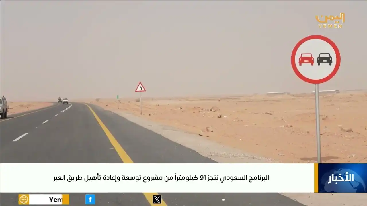الرئيسية/البث المباشر/البرنامج السعودي يُنجز 91 كيلومتراً من مشروع توسعة وإعادة تأهيل طريق العبر البرنامج السعودي يُنجز 91 كيلومتراً من مشروع توسعة وإعادة تأهيل طريق العبر15/11/2025آخر تحديث: 15/11/20250 أقل من دقيقة#قناة_اليمن #اليمن القناة الرسمية التابعة للحكومة اليمنية الشرعية المعترف بها دولياًمقالات ذات صلة دعم دولي وعربي واقليمي كامل لرئيس مجلس القيادة وجهود السعودية لدعم الأمن والاستقرار ووحدة اليمن 27/12/2025 تحالف دعم الشرعية: التحركات العسكرية المخالفة لجهود خفض التصعيد في حضرموت سيتم التعامل معها 27/12/2025 نسخ الرابط تم نسخ الرابط 15/11/2025آخر تحديث: 15/11/20250 أقل من دقيقة إتبعنا شاركها فيسبوك X لينكدإن Tumblr بينتيريست Reddit VKontakte واتساب تيلقرام مشاركة عبر البريد طباعة