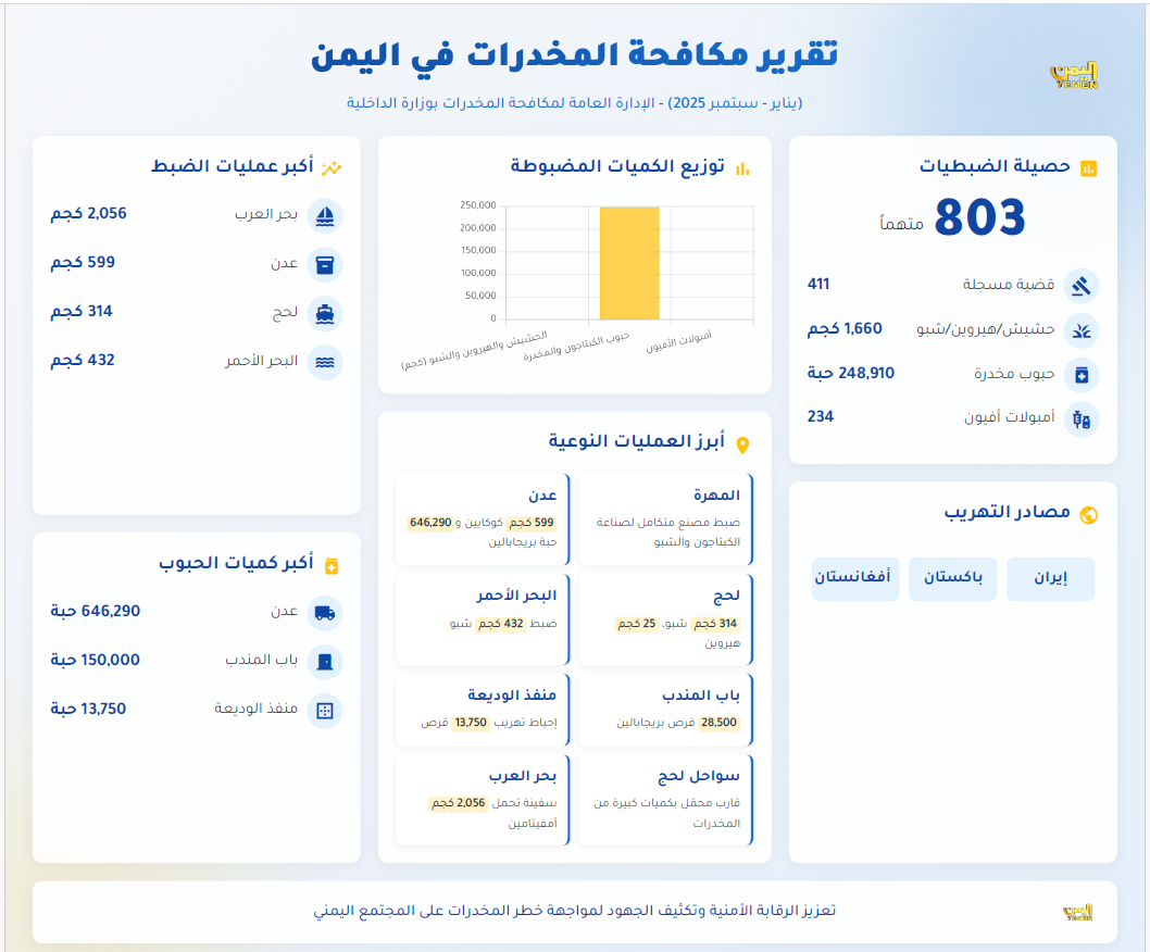 وأشار التقرير إلى أن مصادر التهريب تنوّعت بين إيران، باكستان، وأفغانستان، وسط دعوات لتعزيز الرقابة الأمنية وتكثيف الجهود لمواجهة خطر المخدرات على المجتمع اليمني.