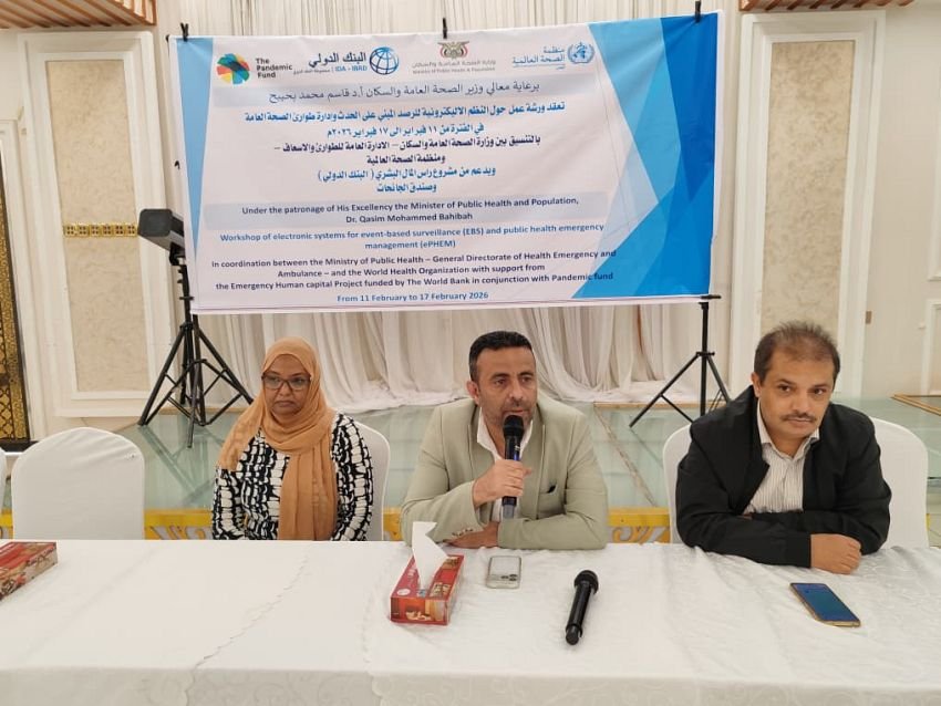 وتهدف الورشة، التي تستمر أسبوعًا، إلى تدريب 37 مشاركًا من كوادر الطوارئ والترصد الوبائي في المحافظات المحررة على مفاهيم الرصد المبني على الحدث، وإدارة البيانات الصحية إلكترونيًا، وتفعيل غرف عمليات الطوارئ.