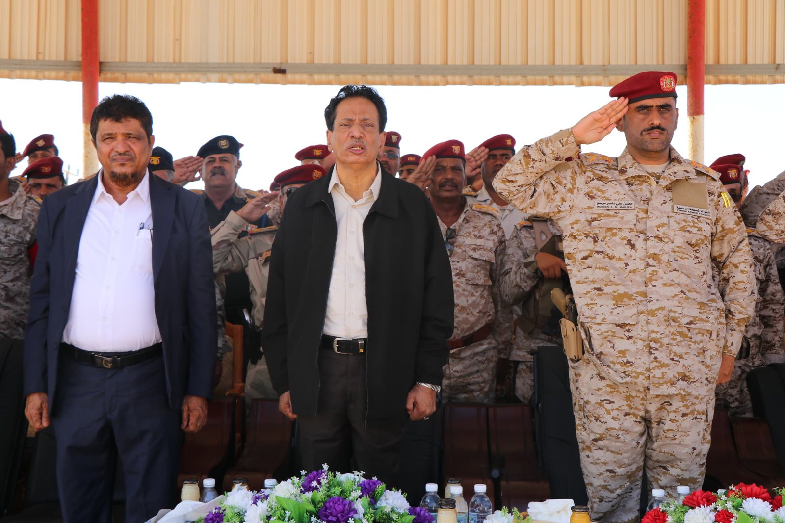 وحيّا المحافظ بن ياسر، الضباط والصف والجنود على تضحياتهم في سبيل أمن واستقرار المحافظة.. ناقلًا لهم تحيات القيادة السياسية ممثلة بفخامة الرئيس الدكتور رشاد العليمي، رئيس مجلس القيادة الرئاسي وأعضاء المجلس.