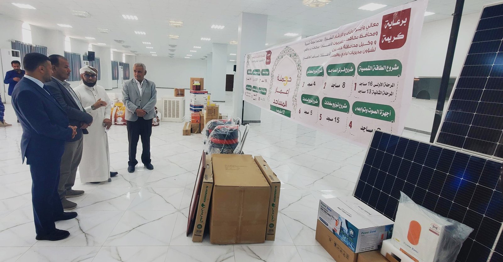 وتعرف وكيل المحافظة ومعه وكيل وزارة الاوقاف لقطاع الارشاد الدكتور عبدالناصر الخطري، ومدير عام مديرية سيئون خالد بلفاس، الى شرح من مدير مكتب الأوقاف بوادي حضرموت محمد بلفاس، حول الحملة التي تشمل تنفيذ 12 مشروعا تتضمن توزيع الاحتياجات الضرورية، وتوفير كل ما يلزم من معدات وتجهيزات من فرش وأجهزة ومواد كهربائية وسباكة وغيرها لعدد من المساجد ، اضافة الى تنفيذ مشروع الطاقة الشمسية لعدد 29 مسجد بمديريات سيئون وتريم وشبام على مرحلتين، وبرامج تلفزيونية واذاعية .