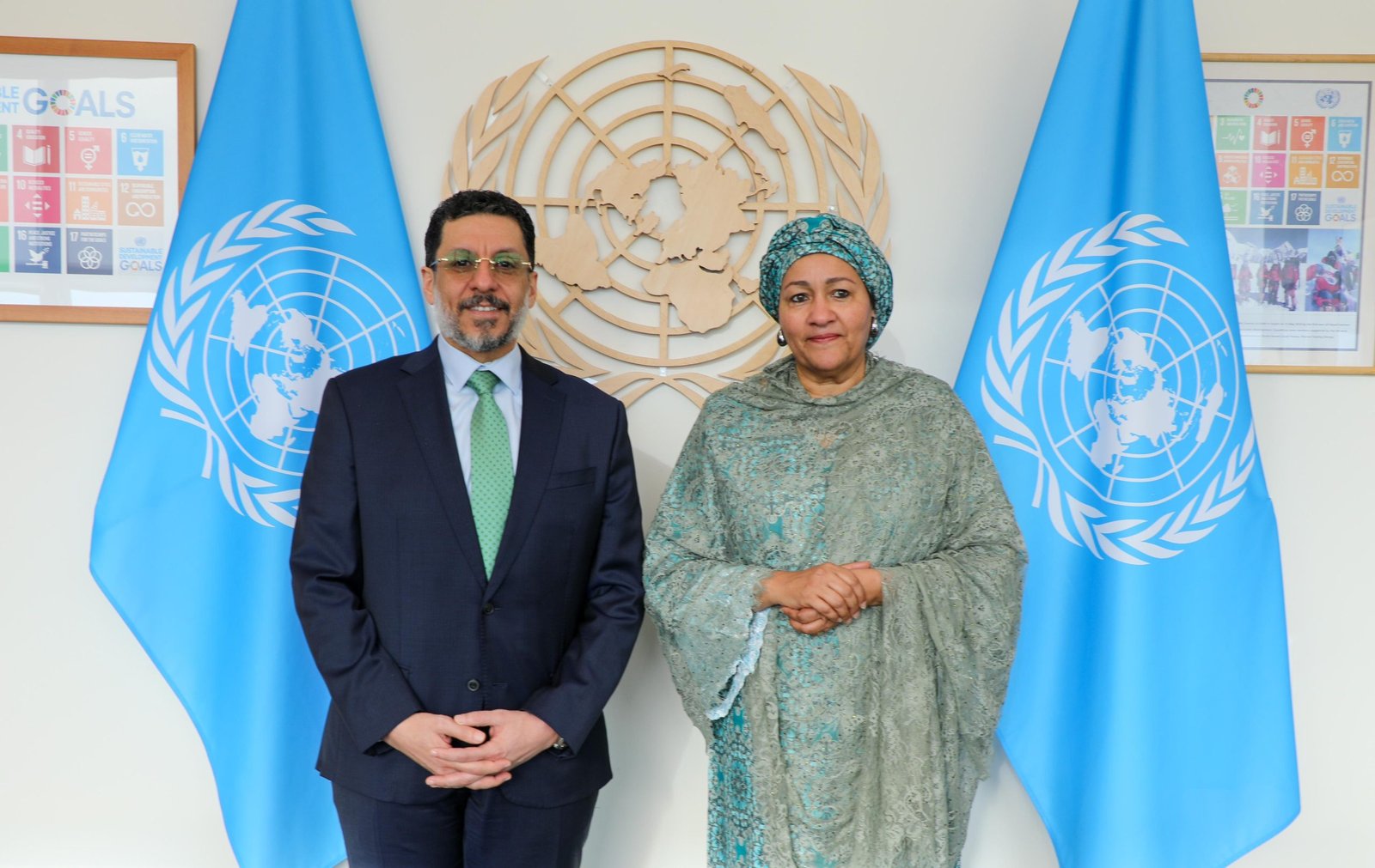 وأكد دولة رئيس الوزراء، خلال لقاء عقده في مقر الأمم المتحدة بنيويورك، مع نائبة الأمين العام للأمم المتحدة أمينة محمد، على ضرورة توجيه المزيد من الجهود نحو الحلول التنموية لتعزيز الاستقرار الاقتصادي وتخفيف المعاناة الإنسانية التي تسببت بها مليشيا الحوثي الإرهابية.