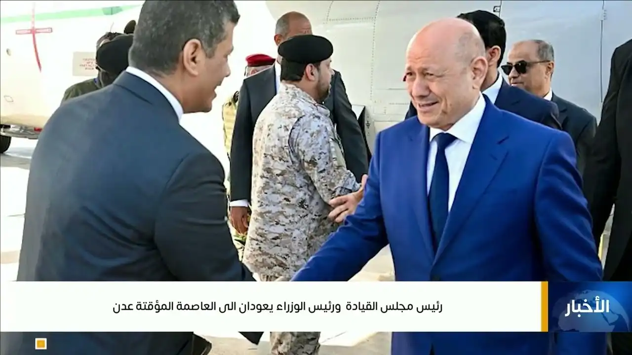 رئيس مجلس القيادة الرئاسي الدكتور/ رشاد العليمي ورئيس #مجلس_الوزراء يعودان الى العاصمة المؤقتة #عدن