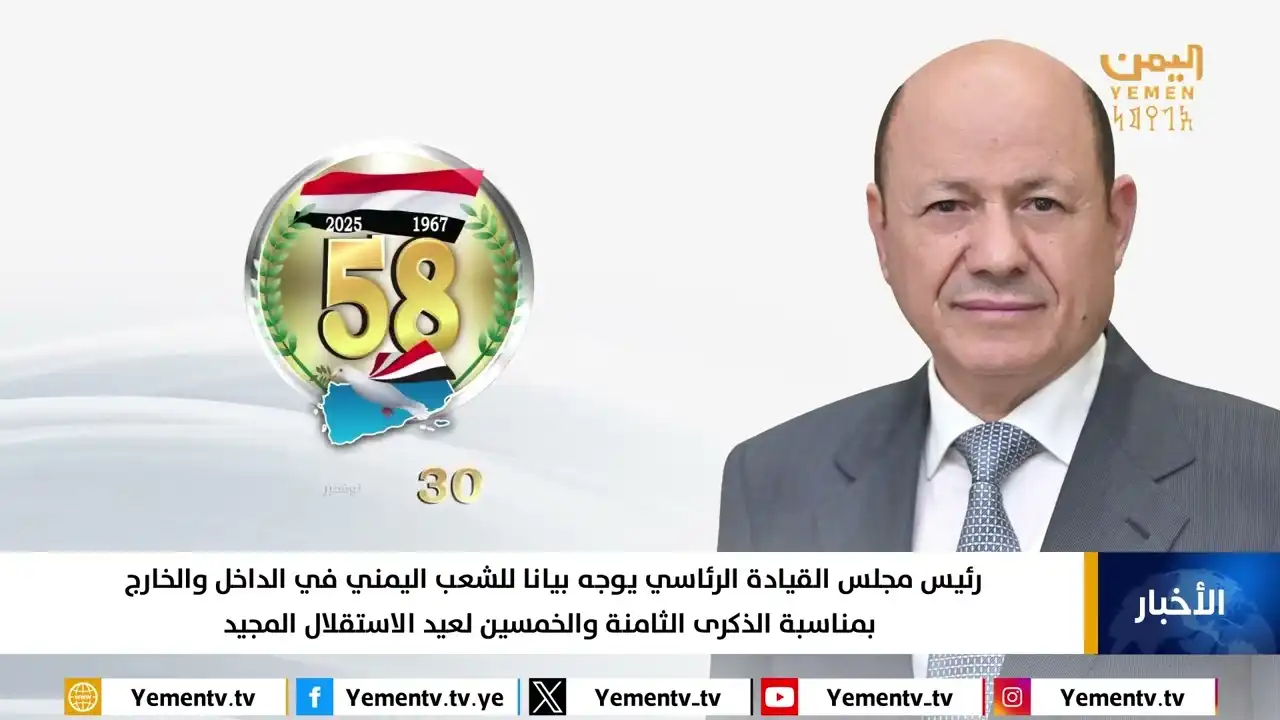 رئيس مجلس القيادة الرئاسي يوجه بيانا للشعب اليمني في الداخل والخارج بمناسبة الذكرى58 لعيد الاستقلال
