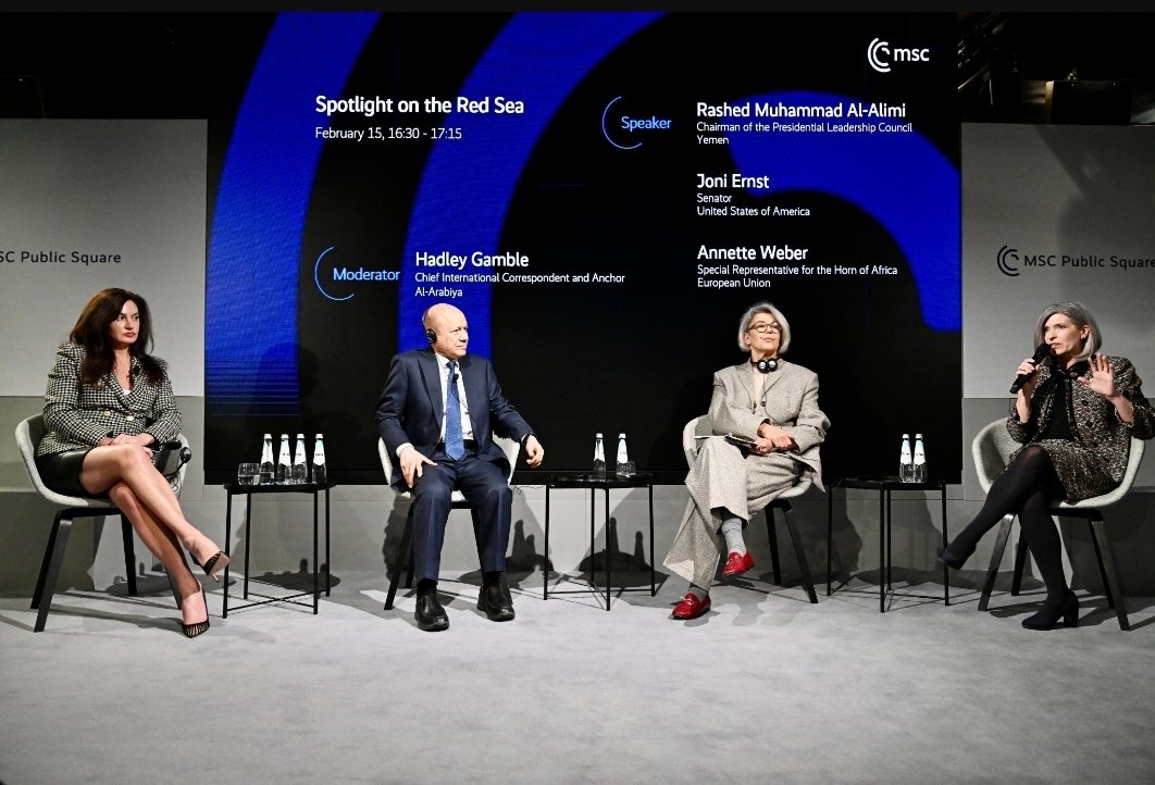 وقال رئيس مجلس القيادة الرئاسي في جلسة حوارية حول امن البحر الاحمر، على هامش اعمال مؤتمر ميونيخ للأمن الدولي ” لإيجاد حلول مستدامة لا بد من تمكين السلطة الشرعية من بسط سيطرتها على كافة ترابها الوطني، والتركيز على دعم التنمية والاستقرار”.