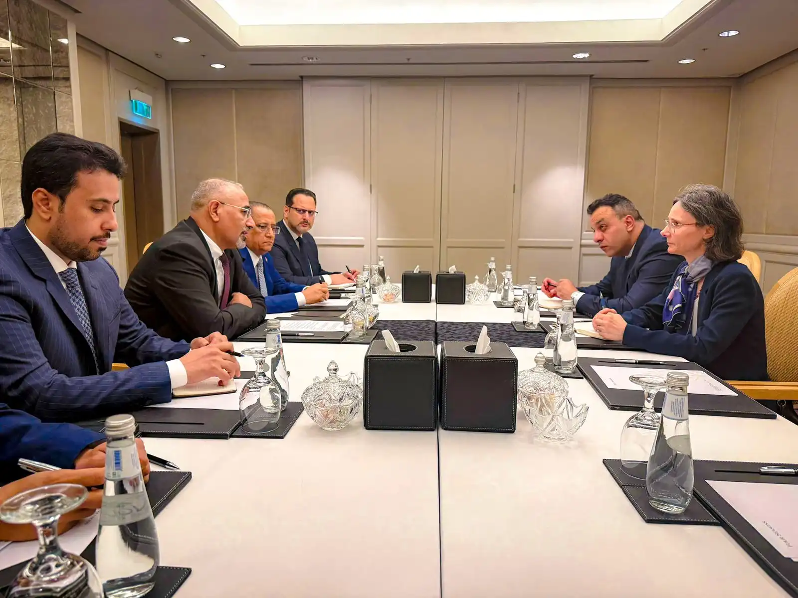 وبحث اللقاء جملة من القضايا السياسية والاقتصادية والإنسانية في اليمن، وفي مقدمتها الأزمة الاقتصادية المتفاقمة التي تعيشها البلاد نتيجة استمرار توقف صادرات النفط والغاز، جراء الهجمات الإرهابية التي شنتها مليشيا الحوثي على موانئ التصدير في محافظتي حضرموت وشبوة، وما ترتب على ذلك من تراجع في الإيرادات العامة وتدهور الأوضاع المعيشية للمواطنين.
