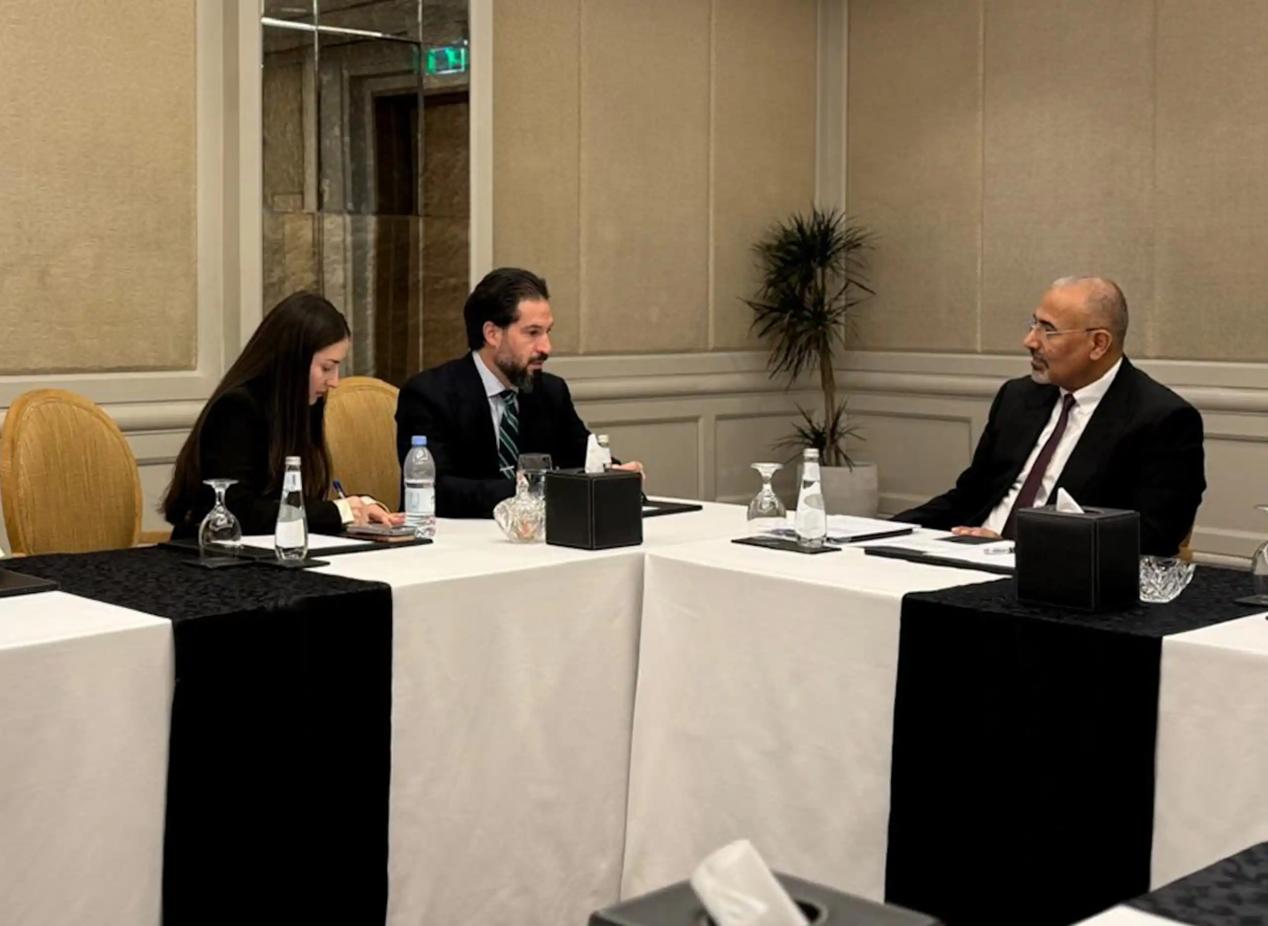 التقى عضو مجلس القيادة الرئاسي، اللواء عيدروس الزُبيدي، اليوم الأحد، القائمَ بأعمال سفير الولايات المتحدة الأمريكية لدى اليمن، جوناثان بيتشيا.