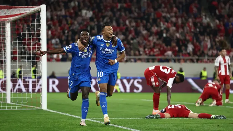 حقق ريال مدريد فوزاً ثميناً خارج أرضه على أولمبياكوس اليوناني بنتيجة 4-3 ضمن الجولة الخامسة من دوري أبطال أوروبا، بفضل تألق النجم الفرنسي كيليان مبابي الذي سجل سوبر هاتريك في الدقائق (22، 24، 29، 60). وسجل للفريق اليوناني كل من تشيكينيو، مهدي طارمي، وأيوب الكعبي، لكن ذلك لم يمنع الريال من اقتناص ثلاث نقاط ثمينة رفعت رصيده إلى 12 نقطة في المركز الخامس.