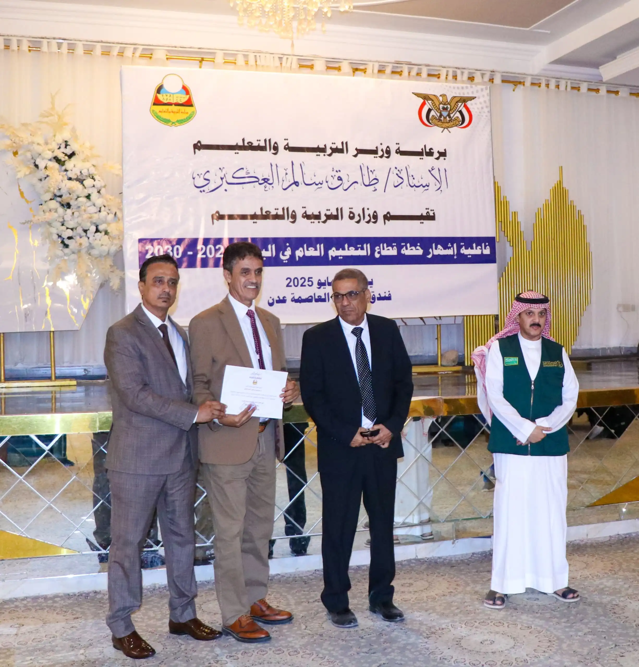 وبعد ذلك قدمت عبر شاشة العرض، مراحل إعداد خطة التعليم للأعوام (2024-2030)، كما تم تكريم أعضاء فريق خطة قطاع التعليم بشهادات تقديرية نظير جهودهم المبذولة خلال فترة إعداد الخطة .