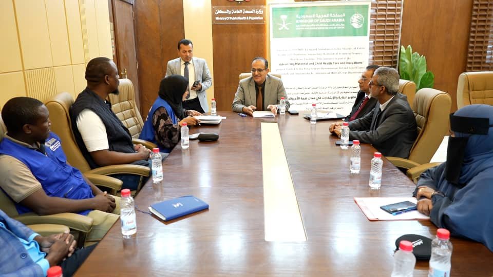 وزير الصحة يبحث مع الهيئة الطبية الدولية تعزيز التدخلات الصحية ويتسلم سيارتي إسعاف