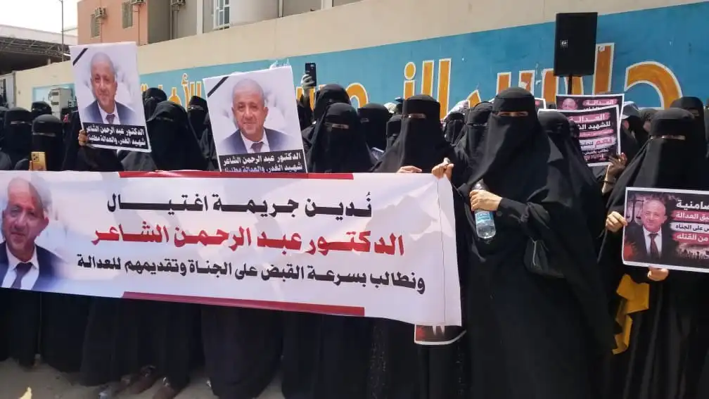 وقفة احتجاجية في عدن تندد باغتيال الدكتور عبدالرحمن الشاعر وتطالب بضبط الجناة