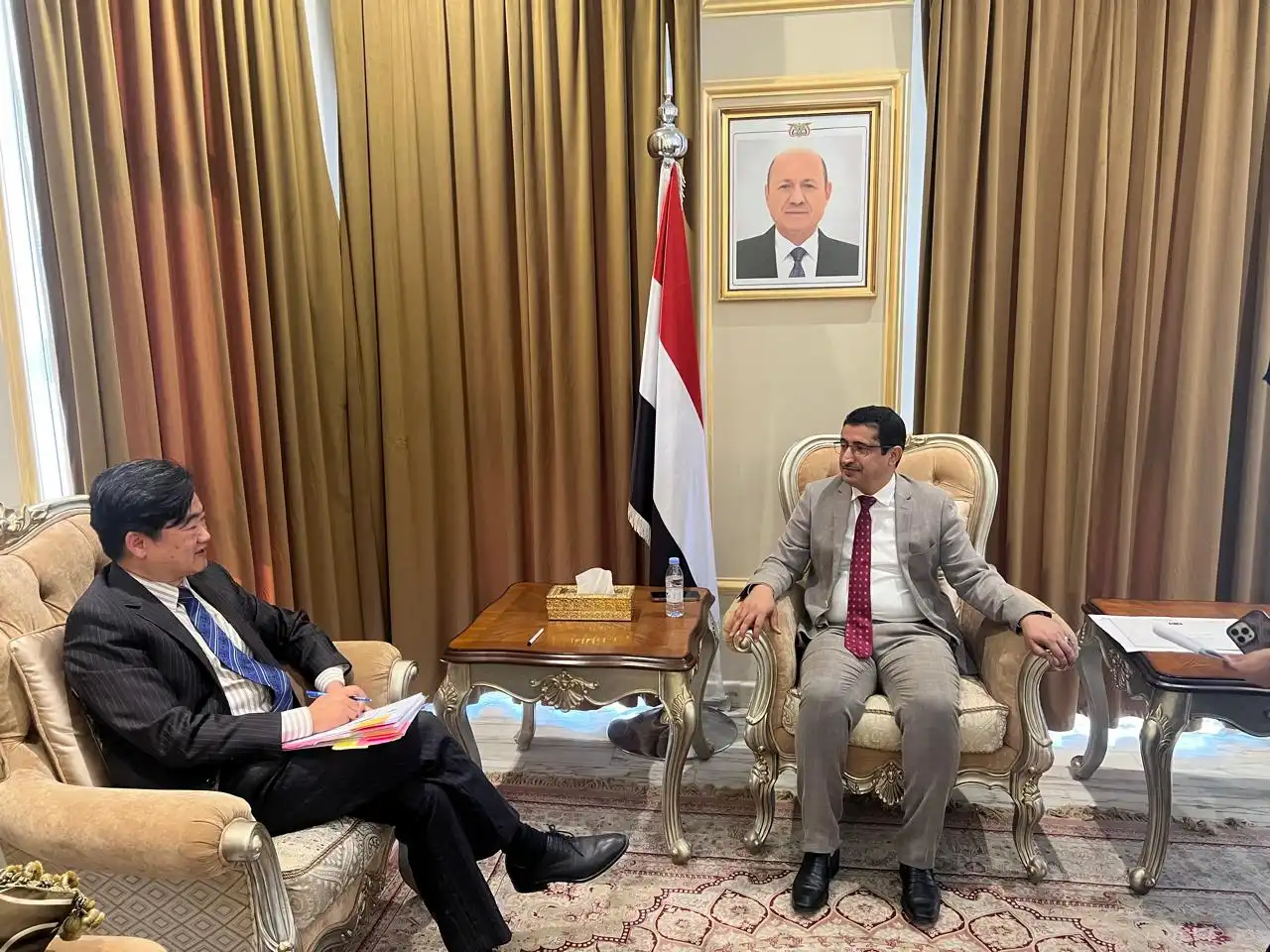 بحث وكيل وزارة الخارجية للشؤون السياسية الدكتور منصور بجاش، اليوم، مع القائم باعمال سفارة جمهورية الصين الشعبية لدى اليمن، تشاو شينغ، التعاون الثنائي بين البلدين والشعبين الصديقين، وسبل تعزيز الشراكة من أجل تحقيق التنمية والسلام في اليمن.