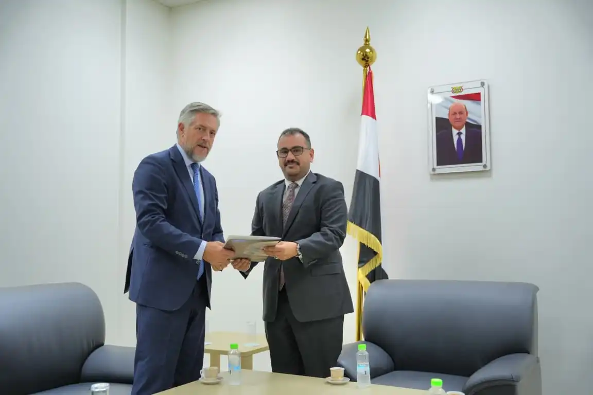 ورحب العود بالسفير الجديد، مؤكدًا استعداد الوزارة لتقديم كافة التسهيلات اللازمة لتعزيز التعاون الثنائي، مشيدًا بمواقف الاتحاد الأوروبي الداعمة للحكومة الشرعية وجهوده في دعم السلام والاستقرار.