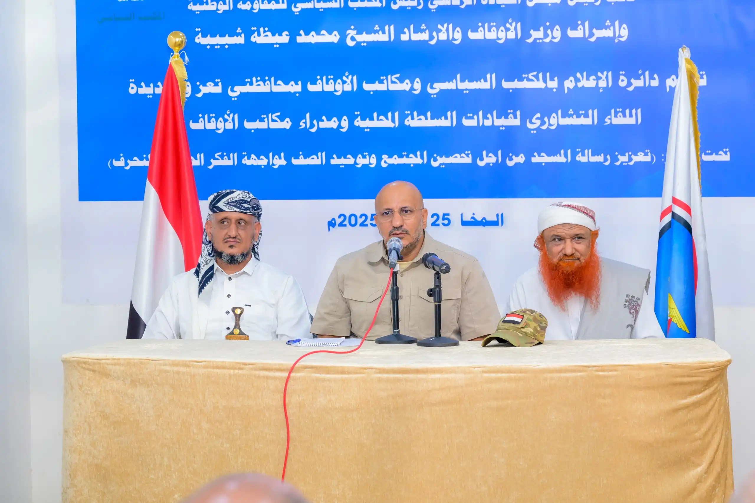 جاء ذلك خلال اللقاء التشاوري للسلطة المحلية ومكاتب الأوقاف بمحافظتي تعز والحديدة، حيث دعا إلى توحيد الخطاب الديني في المساجد، وتعزيز الوعي الوطني والديني لمواجهة الفكر الإيراني الذي تسعى المليشيا لفرضه على المجتمع.