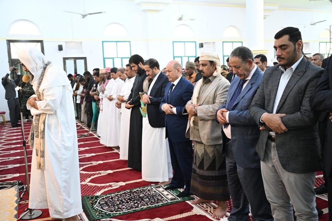 رئيس مجلس القيادة وعضو المجلس عثمان مجلي يؤديان صلاة الجمعة مع جموع المصلين في مدينة المكلا