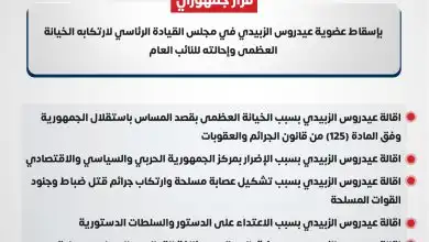 قرار مجلس القيادة بإسقاط عضوية عيدروس الزبيدي في مجلس القيادة الرئاسي لارتكابه الخيانة العظمى وإحالته للنائب العام
